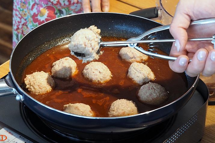 一口ハンバーグの形はアイススクープ(アイスクリームをすくうアレ)で作ります。肉をすくってゆっくりレバーを引くとアッというまにたこ焼きサイズのハンバーグに。「不器用でも同じ大きさのハンバーグが作れる」と好評。ソースが入った鍋にポイと入れフタをして加熱すれば、もう完成!