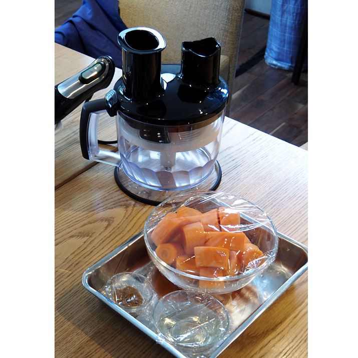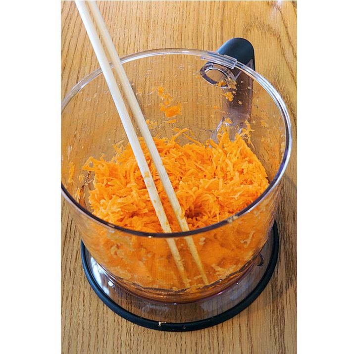 フードプロセッサーのフタには2つの穴があり、片方に本体、もう1つの穴にはニンジンを放りこみます。本体を動作させながら付属の棒でニンジンを押し込めば、あっというまに千切りニンジンのできあがり。約2本分のニンジン(4人分)が、5分もかからず千切りになってしまいました。あとは、千切りのニンジンにカレー粉とすし酢を入れて混ぜるだけ。フードプロセッサーの中ですべての調理ができるので、洗い物が少ないのもうれしいですね。