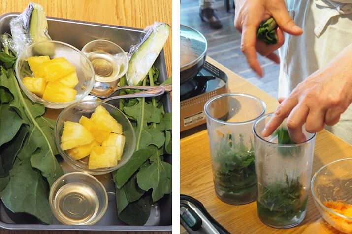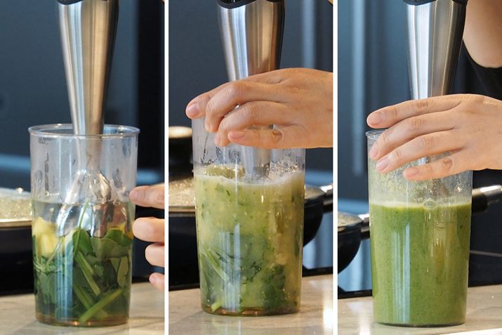 野菜を押し込むようにギュッと抑えながら回すと、20秒ほどで滑らかなスムージーが完成。ちなみに、ブレンダーの注意点は「刃を水に漬けて動かす」こと。刃が水から出てしまうと、水が飛び散ることがあるからだそうです