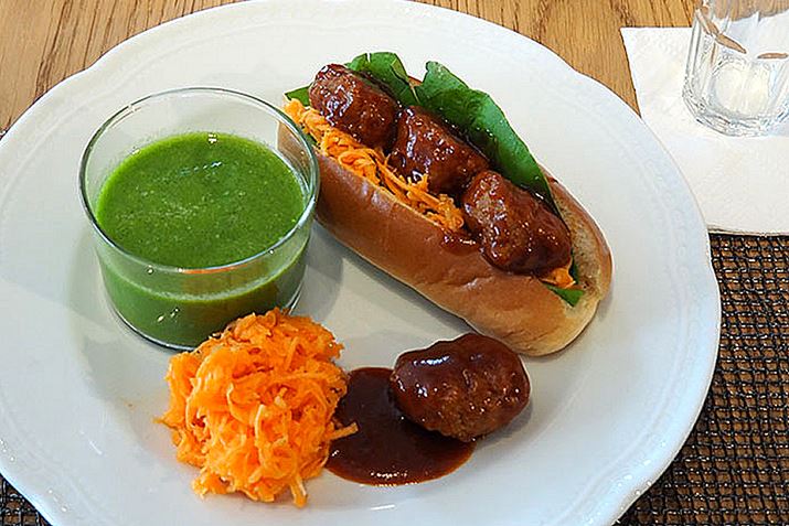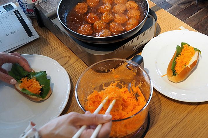作った料理を盛り付けて、完成! パンにはさまれたハンバーグと、繊細にカットされたニンジンのマリネ、そして緑が鮮やかなスムージー。どこから見ても、カフェで提供されるランチプレートのようなオシャレさですね。驚いたのが、これだけ調理してもほとんど手が汚れなかったこと。生徒側のテーブルには水道がなく、ウェットティッシュが置いてありました。教室開始前に「調理で手が汚れて洗いたくなったら、外に水道設備がありますのでご利用ください」とアナウンスされていたのですが、結局誰も水道を必要とするほど手が汚れることがありませんでした。