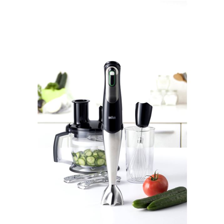 今回料理で使用するのは「ブラウン マルチクイックMQ775」(以下、MQ775)です。こちらは、専用開発されたパワフルなモーターを搭載するハンドブレンダー。MQ775は、本体とブレンダーアタッチメントのほか、フードプロセッサー、スライサーや千切り用の刃ツール、こねベラ、泡だて器が付属。これだけ機能があって16,140円(2016年4月13日現在/価格.com最安値)と、かなりお手頃なのが魅力です。