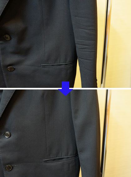 生地が熱と圧力でテカらないようにアイロン面を当てずにスチームだけで行ったが、スーツの肘の部分に付いた深いシワは視認できないレベルで伸ばすことができた