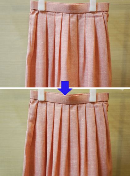 プリーツがゆるんでしまったスカートだが、タグが付いていないため生地の種類がわからず。万一のことを考え、スチームのみで折り目をつけてみたところ、しっかりとしたひだが復活!