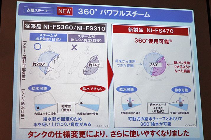 ハンガーに衣類を吊るしたままシワを伸ばせる衣類スチーマーにおいて、スチームの出具合は仕上がりの大きな差となる。従来はタンクから水を吸い上げる部分が前方に固定されていたため、ハンガーにかかった衣類にアイロンをかけようと垂直にするとアイロンの傾きや水量の減りとともに水が吸い上げられなくなり、スチームが出にくくなることがあった。そこで、NI-FS470は給水部分を可動式にし、どの角度にアイロンを向けても給水部が水に届くように改良。さらに、スチームを放出する際に押すボタンの高さを増大することで、操作性を高めた。