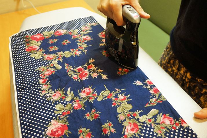 アイロンを少し生地から離し、スチームだけでシワを伸ばしていく。生地を少し引っぱりながら行うとやりやすい