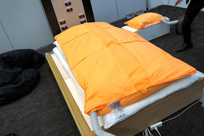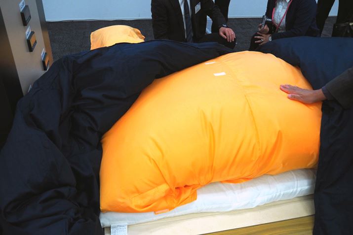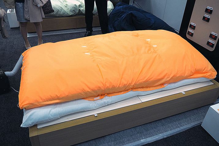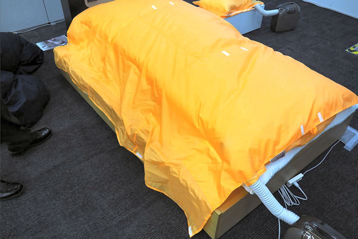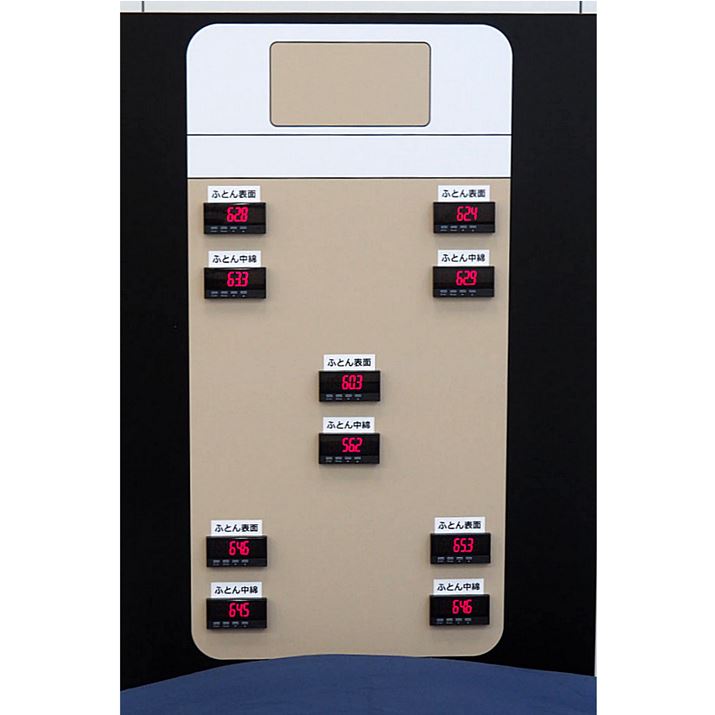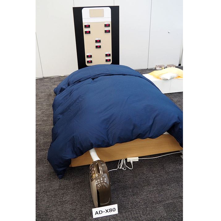 発表会会場内に設置されたベッド。ベッドヘッド部には、乾燥させている布団の現在の温度がリアルタイムで表示。ほとんどが60℃以上になっていた