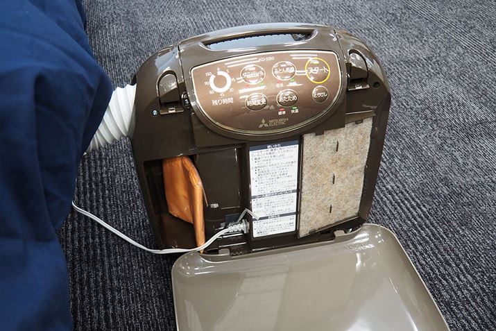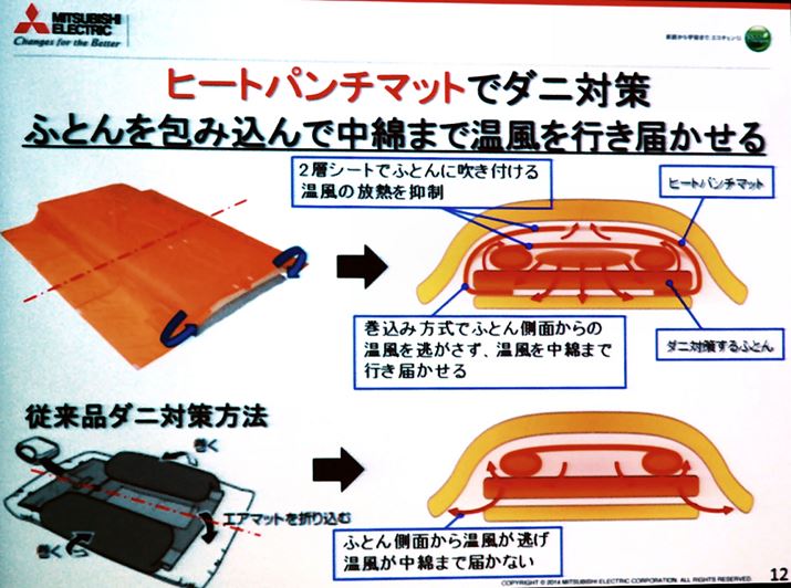三菱電機によると、マットなし布団乾燥機は設置が簡単なものの、どうしても布団の端などに熱ムラができてしまう。そこで、新製品では「あえて」マット式を採用したという。さらに、布団乾燥機用マットは、敷布団と掛布団の間に置くだけのフラット型も多いが、AD-X80の「ヒートパンチマット」は、乾燥させたい布団にマットを「巻きつける」タイプ。布団側面までカバーできるため、熱が逃げずに中綿までしっかりと温まるのだという。