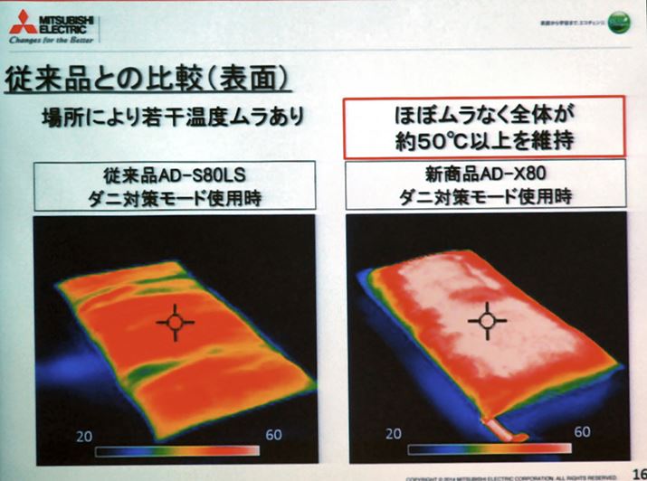 ヒートパンチマットの一部は生地が2重になっている。排気される温風は、一度2重になった層を通るため熱が逃げにくい。旧製品と温度を比較したサーモグラフ写真をみると、AD-X80のほうが温度が高く熱ムラがないのがわかる