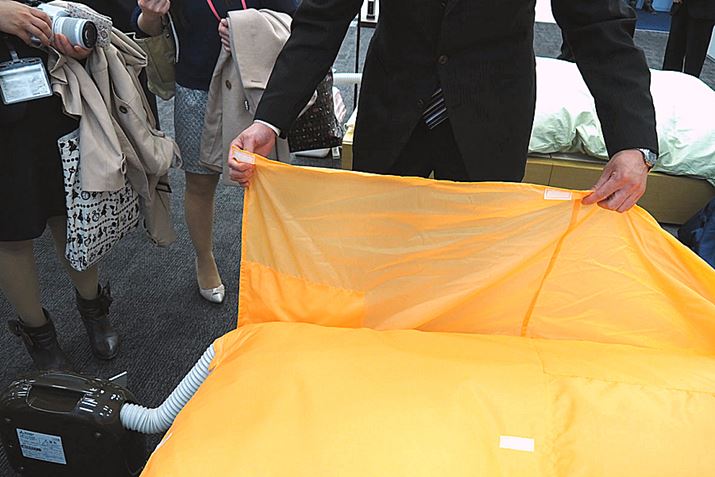掛布団をめくってみると、乾燥中の布団を包み込んだヒートパンチマットが、温風を逃がさずにパンパンに膨れているのがわかる。熱を逃がさず布団を包むことで、ムラのない乾燥を実現