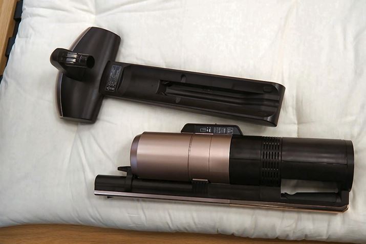 気になる布団用アタッチメント「アレルパンチふとんクリーンアタッチメント」は、ラケット型の特徴的な形状。一般的な掃除機のアタッチメントブラシは、掃除機の本体部分を浮かせ、ブラシだけが布団に接地する。しかし、HC-VXF30Pは掃除機ごと布団に置き、全体をスライドさせて掃除する方式だ。このため、本体の重さを感じにくく、長時間の掃除でも疲れにくい。