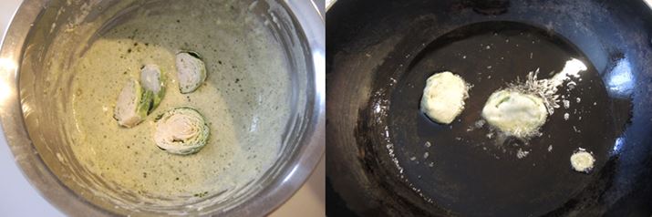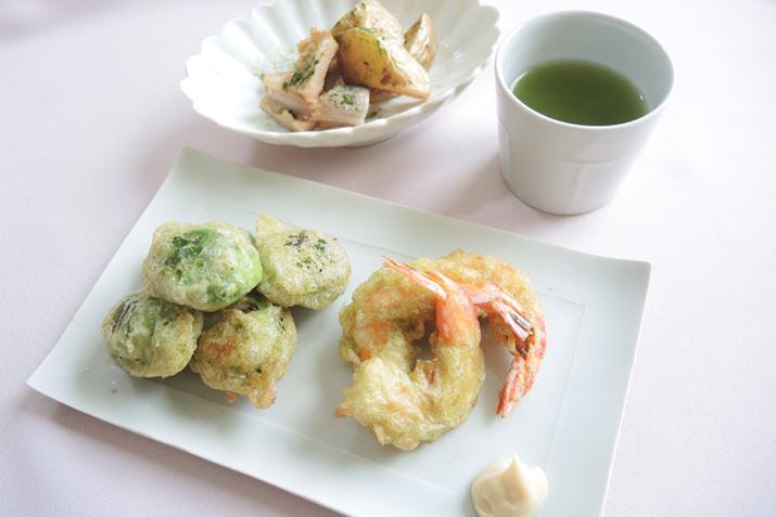 今回は、シャープ「ヘルシオお茶プレッソTE-TS56V」を使って、緑茶が香る春らしいフリットを作ります。食感はふんわりさっくり、挽いたばかりの香り高い茶葉を衣に加えて爽やかな風味に仕上げます。揚げることでお茶の苦みは消えてきれいな色と香りだけが残るので、たっぷり入れて大丈夫。野菜は旬の芽キャベツを使いましたが、エリンギやさつまいもの薄切り、パプリカなどもよく合います。サワラや鯛などの魚もおすすめですよ。