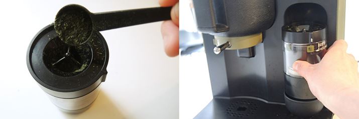 (1)まずは粉末茶を作りましょう。「お茶うす」に緑茶を入れます。