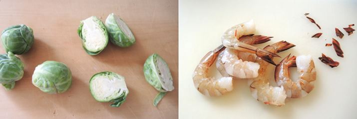 (7)芽キャベツとエビ、それぞれに薄力粉(分量外)を少しまぶしておきます。