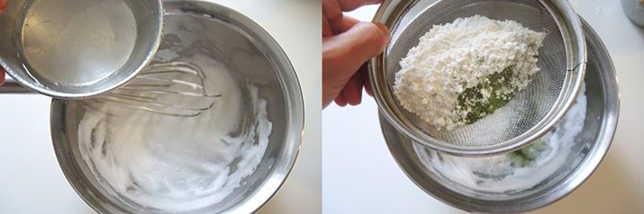 (9)すぐに薄力粉、コーンスターチ、粉末茶(お茶スプーン大2杯)をふるい入れましょう。