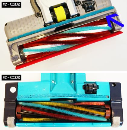 一般的な吸込口を採用している下位モデル「EC-SC320」と比較してみると、EC-SX520のほうは吸引部分と回転ブラシのあいだに仕切りがあることがわかる。この構造により吸気風スピードが100km/hに向上