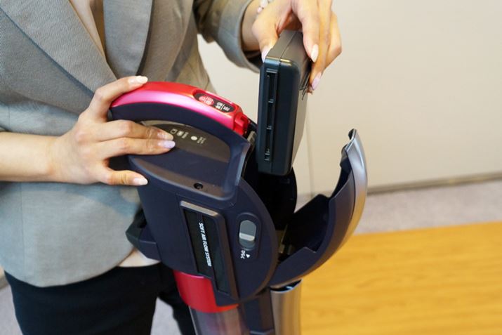 ヘッドの進化が大きなポイントだが、ほかにも前モデルからの改良点があるので紹介しておこう。目に見えないゴミをセンサーで検知してキレイになったかを知らせてくれる機能やプラズマクラスターイオンが放出されるダストカップ、そしてたっぷり掃除できるように交換用のバッテリーが同梱されるなど、メイン掃除機としての満足度を高める工夫が施されている。
