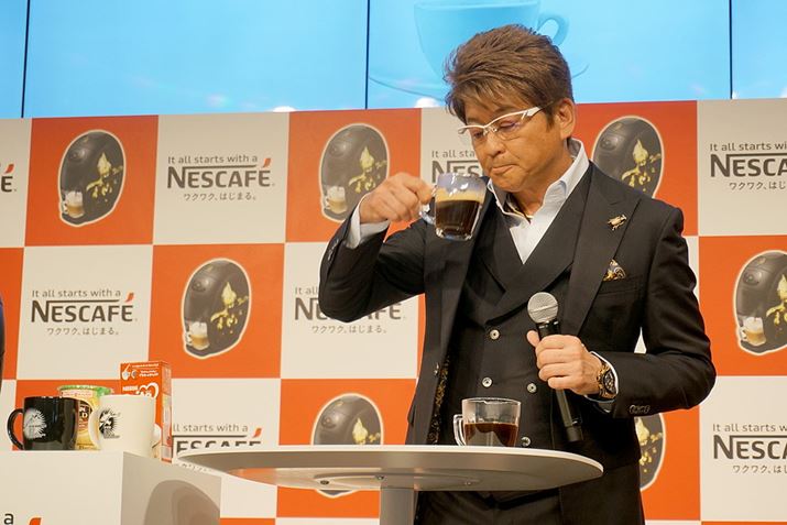 Pepper からの第2問「どちらのコーヒーが『バリスタ』でいれたものでしょう」。おうちでも「バリスタ」で入れたコーヒーを楽しんでいるという哀川翔さんは、ひと口も飲まずに「左が『バリスタ』」と即答。「なぜなら、『バリスタ』でいれたコーヒーには、“クレマ(泡)”があるから」と、大正解でした。写真は、「でも、せっかく入れてくれたので」と、一応どちらのコーヒーも味わう哀川翔さん