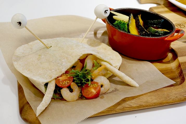 こちらは「カネゴンピタサンド」。カネゴンの口からお金がこぼれ落ちている様子を小エビやプチトマトで表現されています