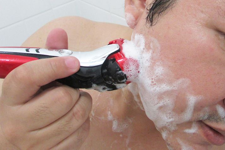 できた泡をヒゲ周辺に塗布してからシェービングしていく。たっぷりの泡と切れ味のよい刃のおかげか、ヒゲが刃に引っかかる感覚はない。肌すべりと切れ味のよさは前モデルでも体験済みだが、「ES-ST8N」では首振り機構によってヘッドの密着度がより高まったことも実感。これまで「シェーバーのヘッドは肌に垂直」というのを意識しながら注意深くすべらせていたものの、人の顔面は思った以上に凹凸があるのでうまくできない場合もあった。「ES-ST8N」はヘッドが動いて密着することで、その問題を解消してくれている。密着することで肌への負担が増してしまったかと思いきや、剃り上がりもヒリヒリ感は皆無だった。目視して確認はできないものの、「スムースローラー」によって肌への摩擦が低減できている証拠だろう。