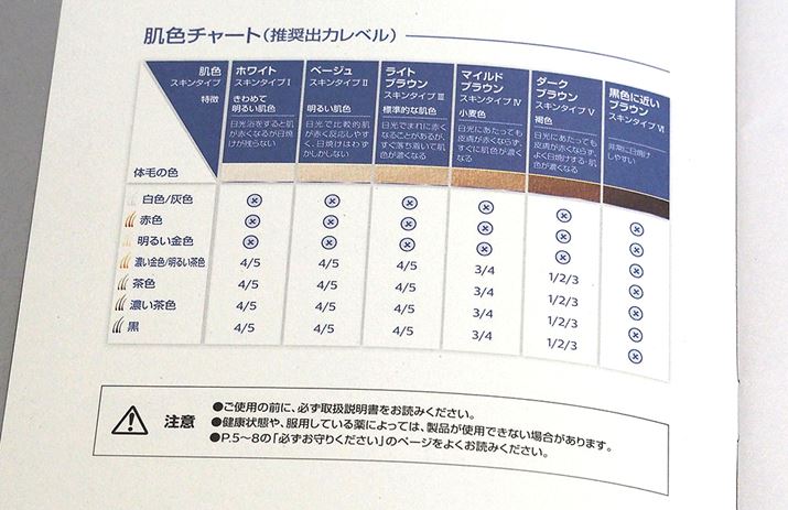 説明書にある照射レベルの推奨値。黒に反応するため、肌色が濃い人は弱いパワーでケアします。また、日焼け時など使用できないタイミングもあるため、このあたりは必ず説明書をチェックしてください