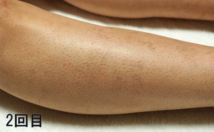元のスネ毛と照射1回目(2週間経過)、2回目(2週間経過)の比較写真。1回目からかなり毛が減っています。2回目以降も少々毛が残っているものの、観察すると、これは本人が適当にライトをあてたために照射し忘れた部分ができてしまったためと思われます