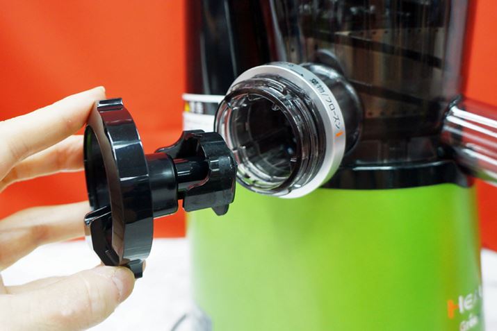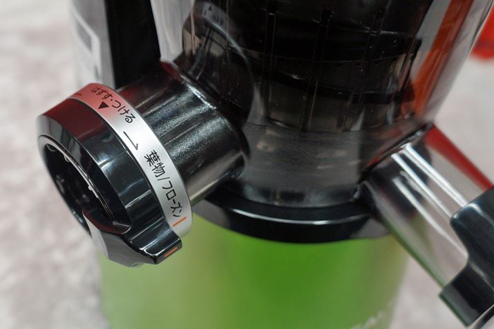 基本的な部分は、ジュースプレッソもグリーンプレッソも同じ。グリーンプレッソには、絞りかすの排出口に切り替えダイヤルが搭載されているのがポイントだ。大雑把に説明すると、普通に果物や野菜でジュースを作る時と葉物野菜を扱う際に絞りかすの出やすさが変えられる機構を設けている。これにより繊維(絞りかす)の詰まりが低減されるだけでなく、野菜を刻まずに投入できるようにもなった。文章だけではわかりにくいので、写真を交えながらグリーンプレッソ独自の構造をジュースプレッソと比較しながら見ていこう。