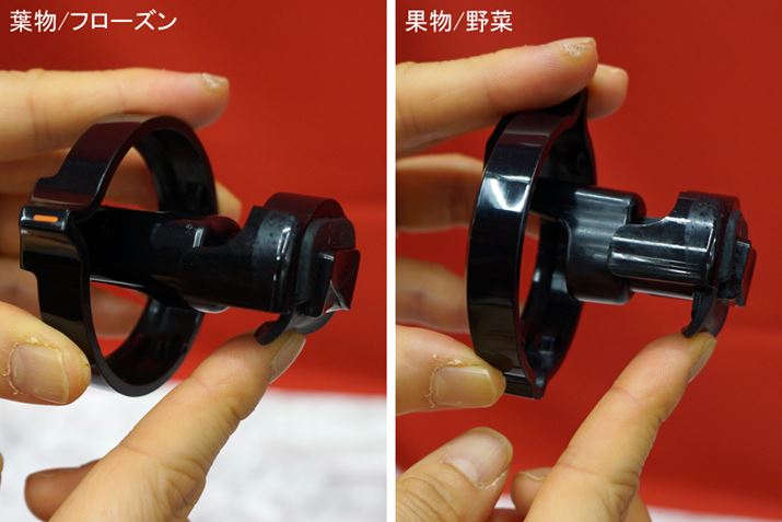 パッキンの曲がり具合は、どのように調整しているのか説明しておこう。「果物/野菜」に切り替えると、写真右のように硬いパーツがパッキン部分に出てくるため曲がらなくなる。意外にアナログな手法だ
