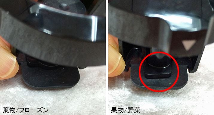 葉物野菜を使った青汁や凍らせた食材でフローズンデザートを作るための「葉物/フローズン」と、普通のジュースを作る「果物/野菜」にダイヤルを切り替えできるようになっている