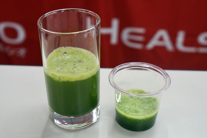 グリーンプレッソで作った青汁(小松菜&りんご)を試飲してみる。比較のため、ミキサーで作った青汁(右)も飲んでみたが、グリーンプレッソのほうが繊維質がなくてサラサラとしているうえ、野菜や果物の甘みもたっぷり