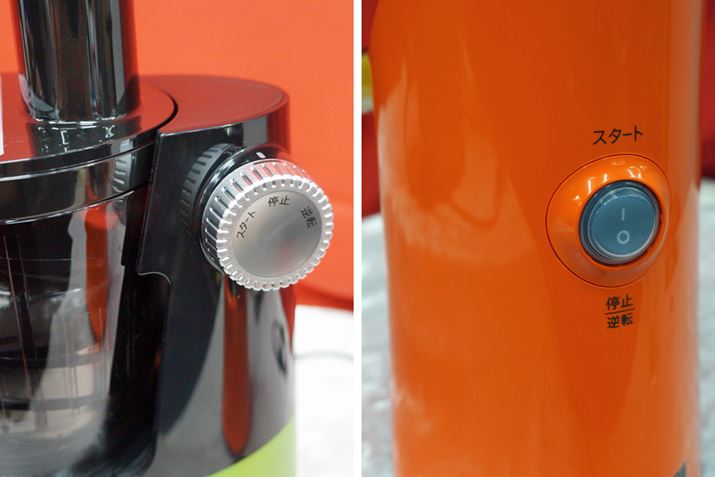 ジュースプレッソ(右)では背面にあるスタート/停止、逆回転のボタンを、グリーンプレッソは側面に配置。正面に立ってジュースを作る際にも、操作しやすくした
