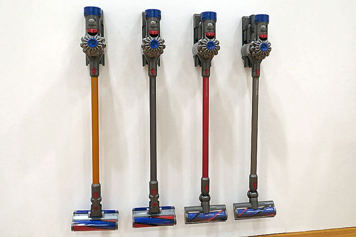 左から、「V8 フラフィ」「V8 フラフィ プラス」「V8アニマルプロ」「V8 アブソリュート」。本体サイズは250(幅)×224(高さ)×1244(奥行)mm(クリーナーヘッド、パイプ、バッテリー含む)。重量は、ソフトローラークリーナーヘッド装着時が2.61kg、ダイレクトドライブクリーナーヘッド装着時が2.55kg
