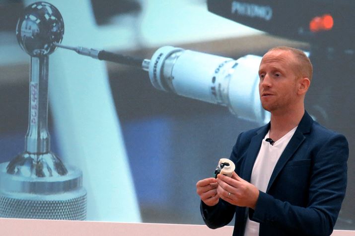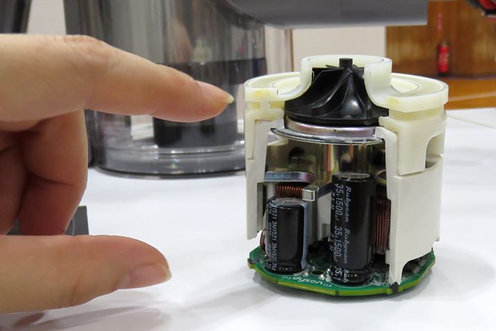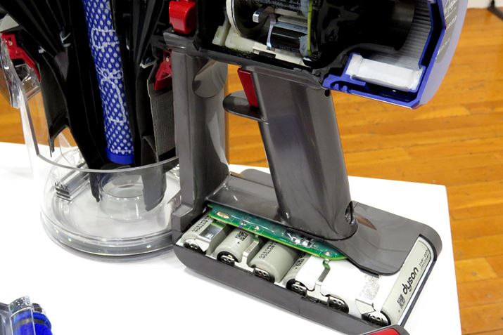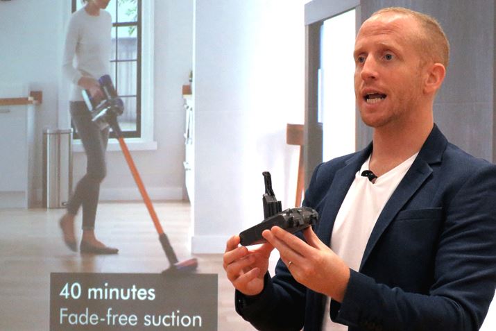 グラント氏が手にしているのが新開発の「ダイソンデジタルモーターV8」。制御するアルゴリズムを変更するなどしたことで、前モデルよりも1万回転/分多い最大11万回転/分を実現