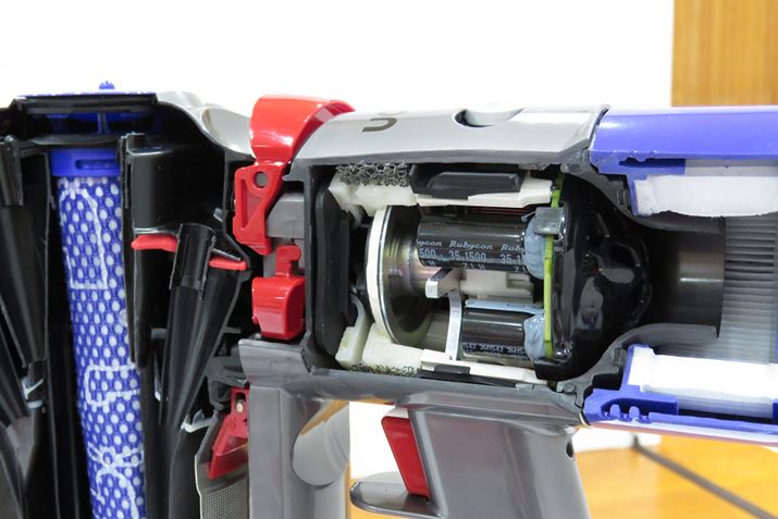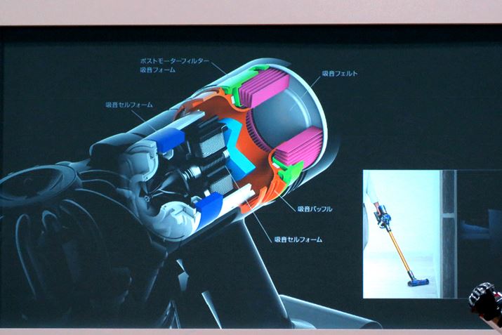 吸引力はアップしたが、稼動音は50%の低減を実現した(「MAX」モード時)。クリーナー内部の静音装備や風路を見直し再設計したことで、V6シリーズと比較して約50%の静音化に成功。さらに、音響工学の面からも見直し、フィルターを追加するなどして音質が改善されているのだという。