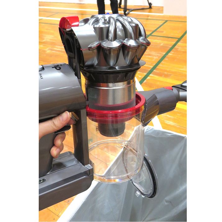 ダイソンの掃除機といえば高い吸引力で知られているが、V8では最大11万回転/分の「ダイソンデジタルモーターV8」が新搭載されさらにパワーアップ。前モデル「V6」に比べ吸引力が約15%アップしたという(最大級引力で100AWから115AWに向上)。その実力をアピールする実験も行われたのでケビン・グラント氏の解説とともに紹介しよう。