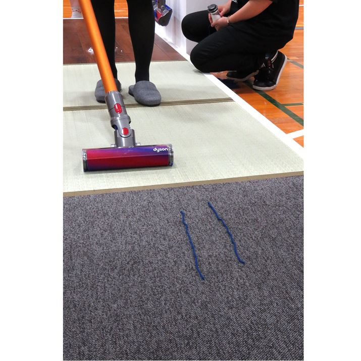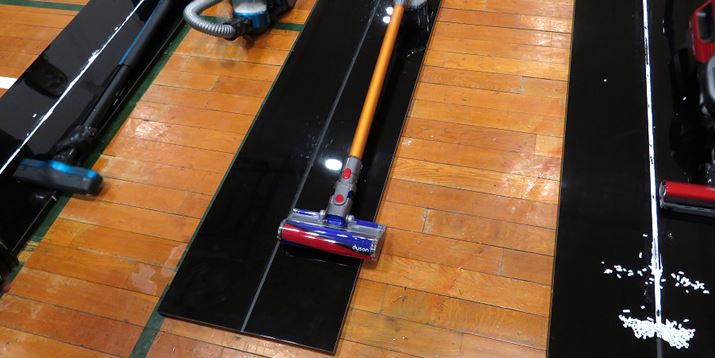 V8と他社の掃除機(同クラスのコードレス、キャニスター型)の吸引力の違いをチェックする実験も行なわれた。幅1cm、深さ5mmの溝が彫ってある黒いアクリル板の上に、猫砂と重曹を撒き、それぞれ一番強い運転モードで吸引してみるというもの。結果は動画でご確認いただければ一目瞭然だが、V8ではほとんど残すことなく擬似ゴミを掃除できていることがわかる。