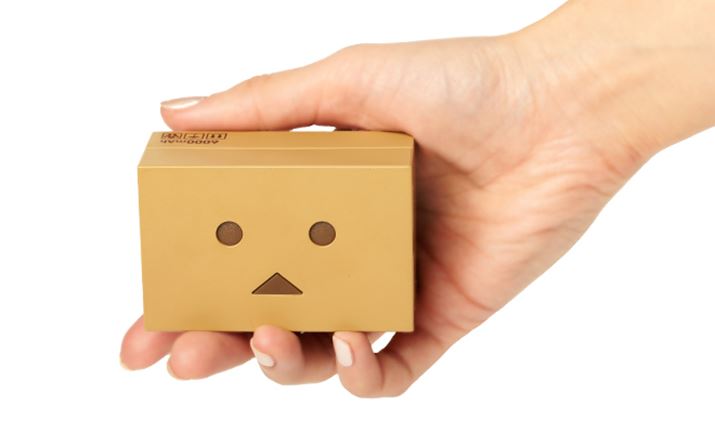 人気漫画「よつばと!」に登場する段ボールキャラクター「ダンボー」の顔型モバイルバッテリーです。ダンボーのデザインを採用したモバイルバッテリーは現在、数種類発売されており、サイズの大きいものやカラフルなものも展開されていますが、こちらは「目が光る」ギミックつき! 目の部分のLEDライトが黄色、オレンジ、赤に点灯することで、本体の電池残量がわかるようになっています。そのうえ、三角の口が電源ボタンになっているため、本体に無駄なスイッチ等がなく、原作のデザインを忠実に再現しつつ、使い勝手のよさも両立しているというのがポイントです。