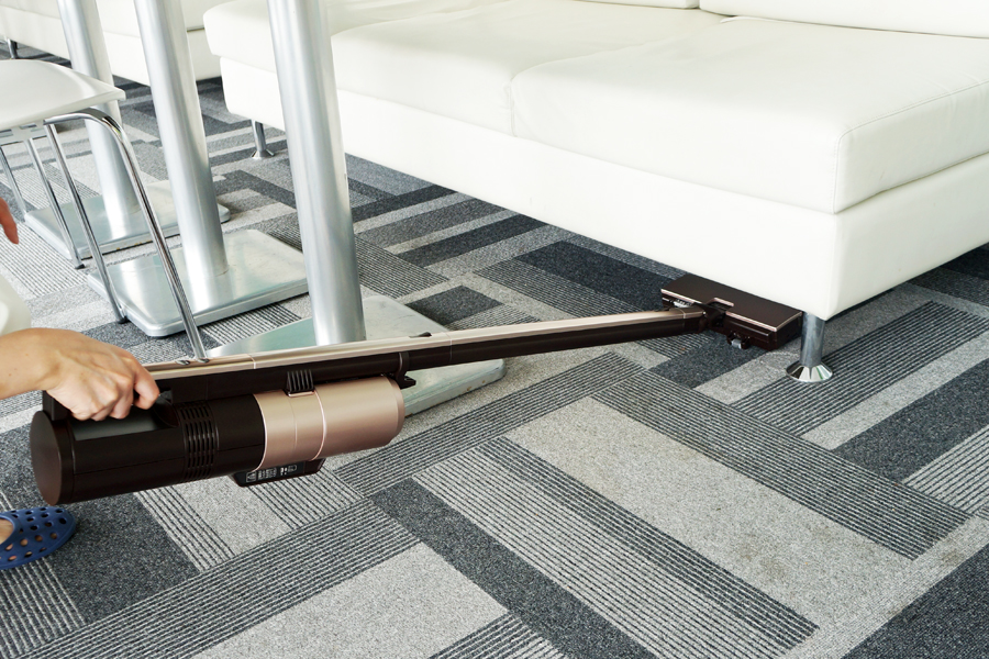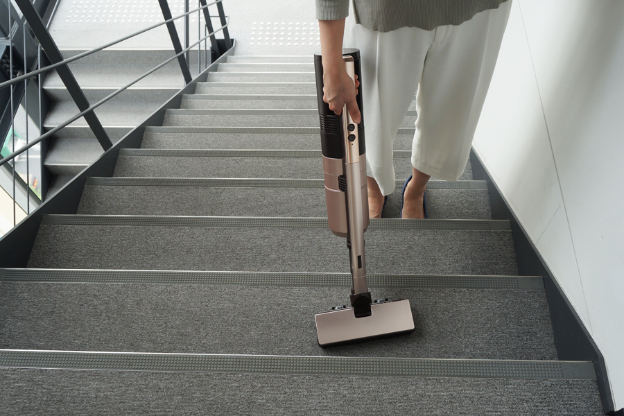 iNSTICKに用意されている運転モードは「標準」と「強」の2つ。どちらのモードも、3軸加速度センサーで掃除機をかけるスピードを検知し、速い時にはパワーアップ、ゆっくりめになるとパワーダウンする節電機能が働く。また、パイプを外せばハンディ仕様となるほか、ふとんクリーナーのように布団掃除ができるアタッチメントが付属している。さっそく、iNSTICKでできるすべての掃除をしてみよう。