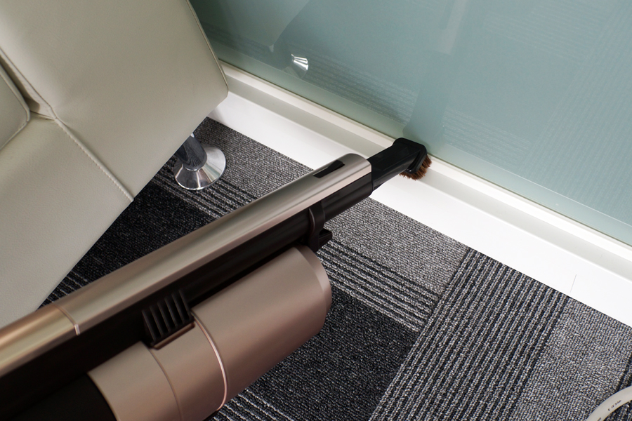 ヘッドをブラシに交換すれば、窓際や棚といった所の掃除もラクラク。クルマの車内の清掃にも役立つだろう