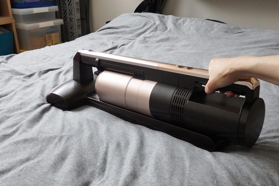 ヘッドだけでなく、本体全体が布団に乗るスタイルとなる。動かしづらそうに見えるが、実際に使ってみると意外とラクに動かせた