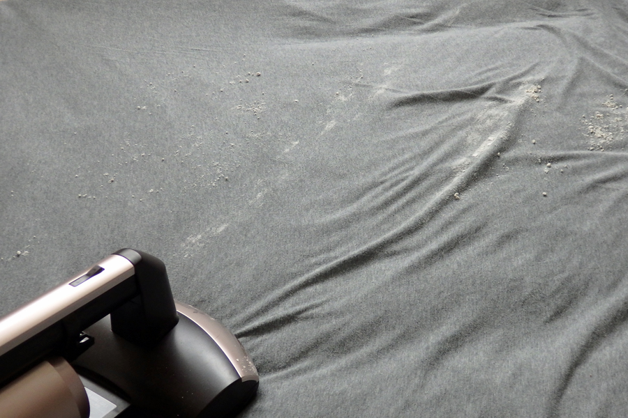 布団の上に賞味期限切れの小麦粉を撒いて、取れ具合を検証してみた。一般的なふとんクリーナーにある寝具に振動を与えるための機構がないためか、走行した前後に小麦粉が広がってしまったが2〜3回往復させれば問題なくキレイに!