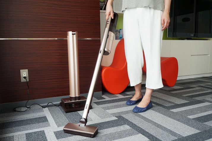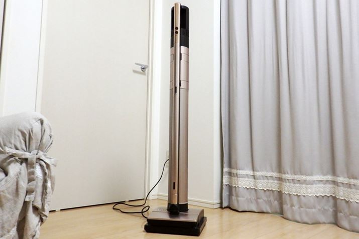 充電台に装着した状態は、ひと目では掃除機だと気付かれにくいだろう。設置サイズは250(幅)×1,087(高さ)×252(奥行)mmなので、それほど場所はとらない