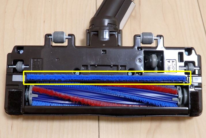 モーター駆動で自走するタイプなため、軽い力で動かすことができる。畳やフローリングの溝に入り込んだゴミをかき出し、絨毯に絡まった毛を取り除く回転ブラシのほかに、ゴミを拭き取る効果のあるブラシを装備(黄色の囲み部分)