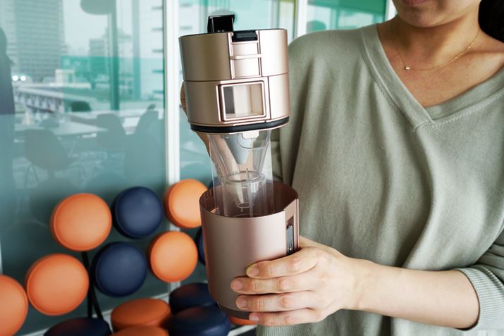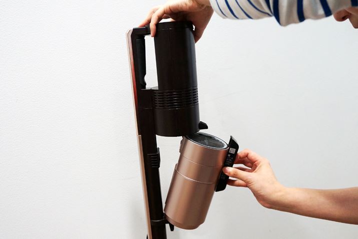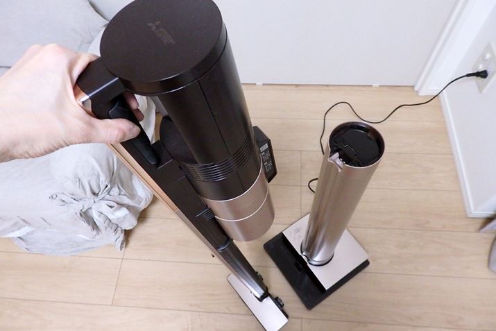 掃除したゴミを捨てたい時はダストカップを取り外す。充電台に掃除機をセットしてしまうと、ダストカップが取りづらくなるので注意