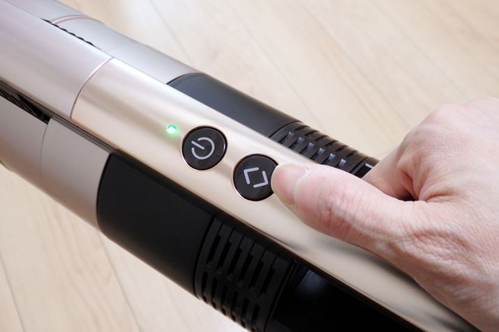 下の動画のように、「AUTO」モードでは掃除機を充電台から外すと風量がアップ! 掃除機を使っている間は強い風量が続くうえ、充電台に掃除機を戻しても約90秒は「強」運転のままとなる。掃除中〜終了間際はホコリが舞いやすいので、理にかなった運転といえるだろう。