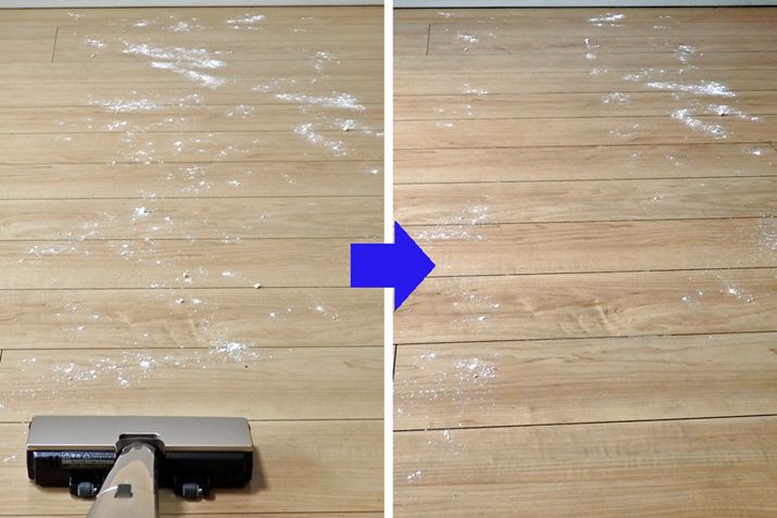 フローリングに賞味期限切れの小麦粉を撒いて一往復してみたところ、おおよそ吸い取ることができた。若干、溝に取り残しがあったが2往復すればバッチリ!