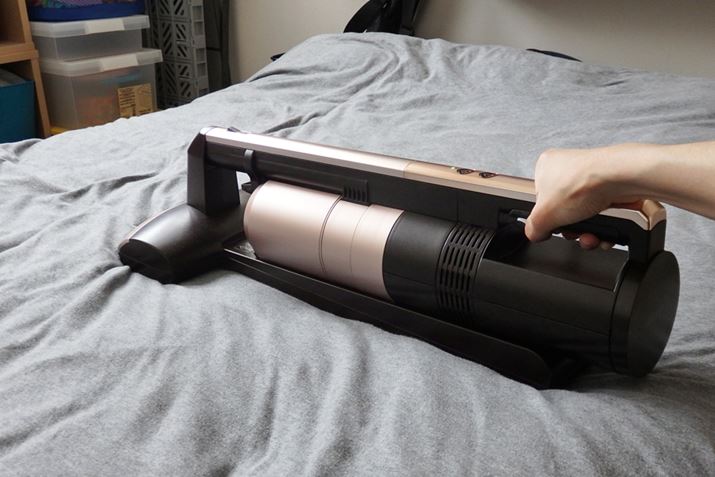 床上や部屋のいろいろな所を掃除したあとは、布団掃除へと移る。iNSTICKに付属のアタッチメントを装着すれば、ふとんクリーナーに変身するのだ。