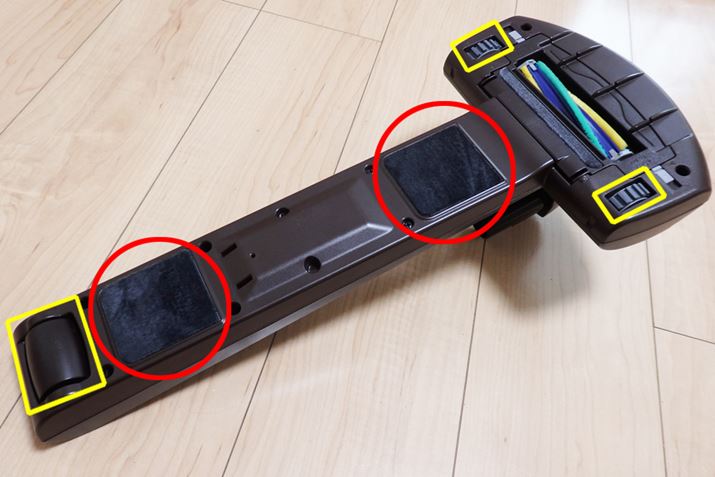 動かしやすさのヒミツはアタッチメントの裏側にあり! ヘッドの部分だけでなく、後方にも車輪を装備している(黄色い囲み部分)。また、回転ブラシの黄色い植毛とボディの植毛部(赤い囲み部分)でダニの死がいやフンなどのアレル物質を抑制するという
