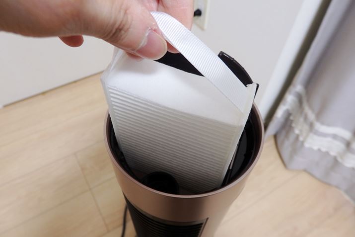 縦長のHEPAフィルターが筒の中に入っている。HEPAフィルターは0.3μm以上の微細な粒子を99.97%以上キャッチできるので、花粉やハウスダストなども除去可能