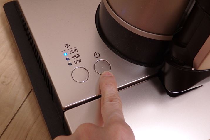 iNSTICKの大きなウリである充電台の空気清浄機能もチェックしておこう。充電台の筒部分から吸い込んだ空気をHEPAフィルターと脱臭フィルターでろ過してキレイな空気にし、台座にある吹出口から放出する清浄方法となっている。運転モードは「AUTO」「HIGH」「LOW」の3つを用意。