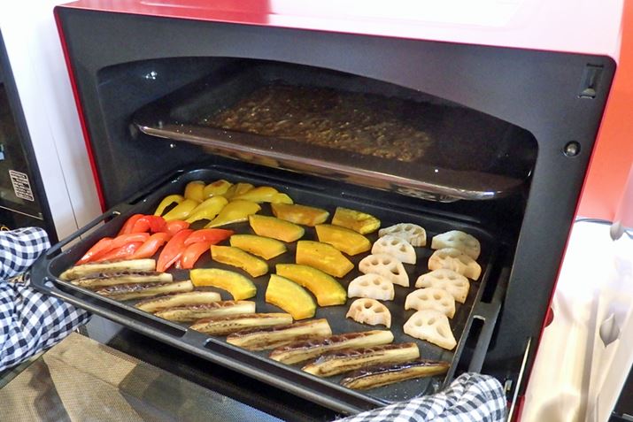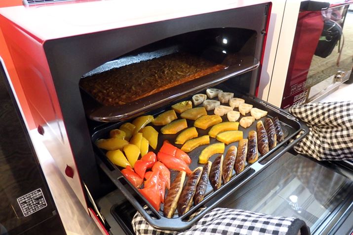 上段に深皿、下段に角皿をセットし、同時にカレーと焼き野菜を調理する実演が行われた。上段で煮込み、下段で焼きを一度に行うというわけだ